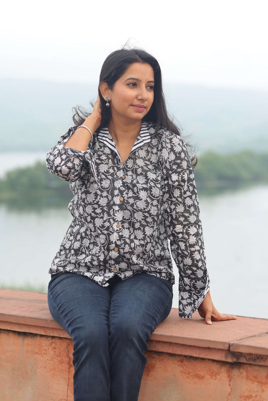 The Noor Shirt – Black & White Hand Block Printed Cotton Shirt