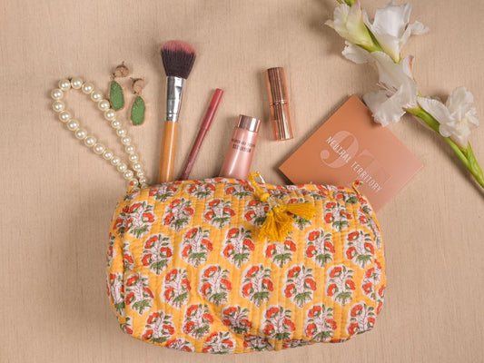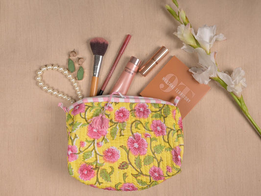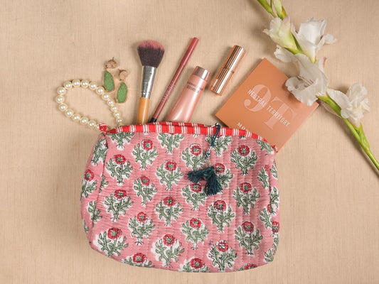 Step into the world of artisanal elegance with our exquisite Vanity Pouches Collection. Crafted by skilled hands and adorned with the intricate beauty of Jaipur's renowned block printing, these pouches redefine style and organization.