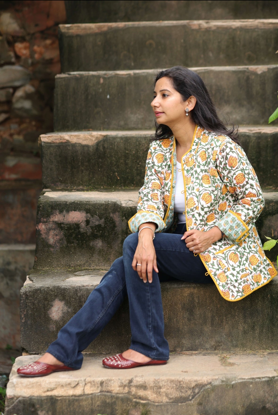 Sage Green Floral Reversible Jacket – Handcrafted Block Print