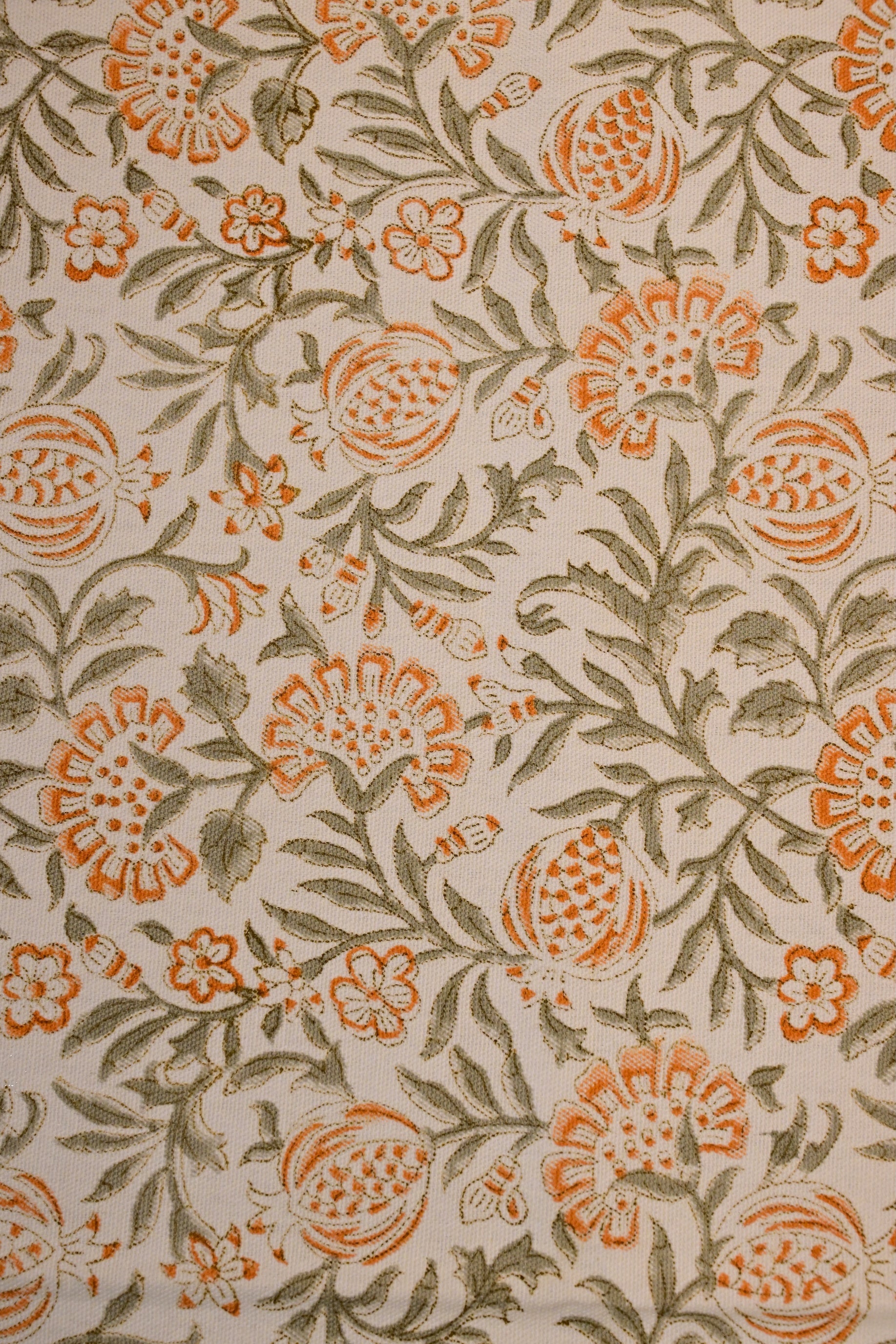 The Anar Tablecloth – White Hand Block Printed Cotton with Grey Vines & Orange Florals